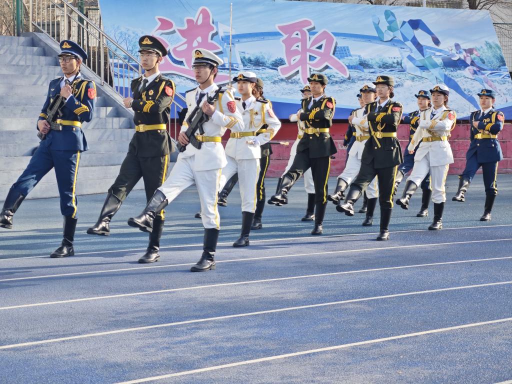 晨光熹微,升旗仪式准时开始。国旗护卫队身姿挺拔,迈着整齐有力的步伐护送国旗走向升旗台。庄严的国歌奏响,五星红旗缓缓升起、迎风飘扬,全体师生庄严肃立,目光坚定地注视着国旗。