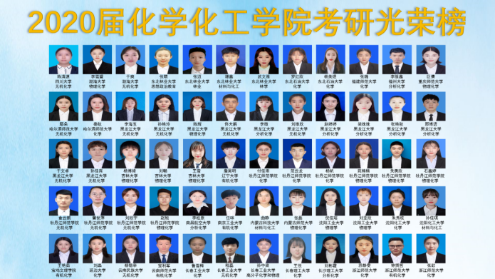 2020年07月17日更新 浏览次 化学化工学院2020届考研光荣榜 序号 姓名 升学院校 研究生专业 1 陈清源 四川大学 无机化学 2 杨博绮 吉林大学 物理化学 3 刘 畅 吉林大学 物理化学 4 王 雪 吉林大学 物理化学 5 李雪盟 渤海大学 物理化学 6 于 爽 渤海大学 无机化学 7 张 萌 东北林业大学 思想政治教育 8 张 迈 东北林业大学 林学 9 谭 鑫 东北林业大学 材料与化工 10 武文雅 东北林业大学 林学 11 罗红欣 东北石油大学 化学 12 杨美煜 东北石油大学 化学 13 张 璐 福建师范大学 化学 14 李维鑫 福州大学 分析化学 15 巨 倩 重庆师范大学 物理化学 16 鄢 朵 哈尔滨师范大学 无机化学 17 秦 航 哈尔滨师范大学 化学 18 李海玉 黑龙江大学 无机化学 19 孙艳玲 黑龙江大学 无机化学 20 陈 辉 黑龙江大学 物理化学 21 佟大鹏 黑龙江大学 无机化学 22 李 微 黑龙江大学 分析化学 23 刘维欣 黑龙江大学 无机化学 24 赵婷婷 黑龙江大学 分析化学 25 梁姝妹 黑龙江大学 分析化学 26 张艳秋 黑龙江大学 分析化学 27 那博语 黑龙江大学 分析化学 28 于文卓 黑龙江大学 无机化学 29 孙佳宾 黑龙江大学 无机化学 30 詹昊明 辽宁大学 有机化学 31 付佳雨 betway中国西汉姆联官网 化学 32 范云龙 betway中国西汉姆联官网 化学 33 杨 帆 betway中国西汉姆联官网 化学 34 苑楠楠 betway中国西汉姆联官网 物理化学 35 关勇欣 betway中国西汉姆联官网 物理化学 36 石鑫婷 betway中国西汉姆联官网 物理化学 37 金云鹏 betway中国西汉姆联官网 无机化学 38 曾世萍 betway中国西汉姆联官网 无机化学 39 刘欣宇 betway中国西汉姆联官网 无机化学 40 赵 旭 betway中国西汉姆联官网 物理化学 41 李松原 南昌航空大学 分析化学 42 任 咪 南京工业大学 有机化学 43 曲 静 内蒙古科技大学 材料与化工 44 张 磊 内蒙古师范大学 物理化学 45 倪佳瑶 沈阳工业大学 物理学 46 刘亚欣 沈阳工业大学 物理学 47 朱秀枝 沈阳化工大学 化学 48 孙佳琪 沈阳化工大学 材料与化工 49 王艳茹 宝鸡文理学院 有机化学 50 刘 晶 延边大学 化学 51 杨锴辛 云南民族大学 无机化学 52 宝利军 云南师范大学 有机化学 53 鲁雪梅 长春工业大学 化学 54 程 磊 长春工业大学 无机化学 55 孙中梁 长春工业大学 高分子化学和物理 56 王 悦 长春工业大学 化学 57 刘彬霞 长沙理工大学 分析化学 58 苏静雯 浙江师范大学 化学 59 钟赟哲 浙江师范大学 有机化学 60 张 歆 浙江师范大学 化学