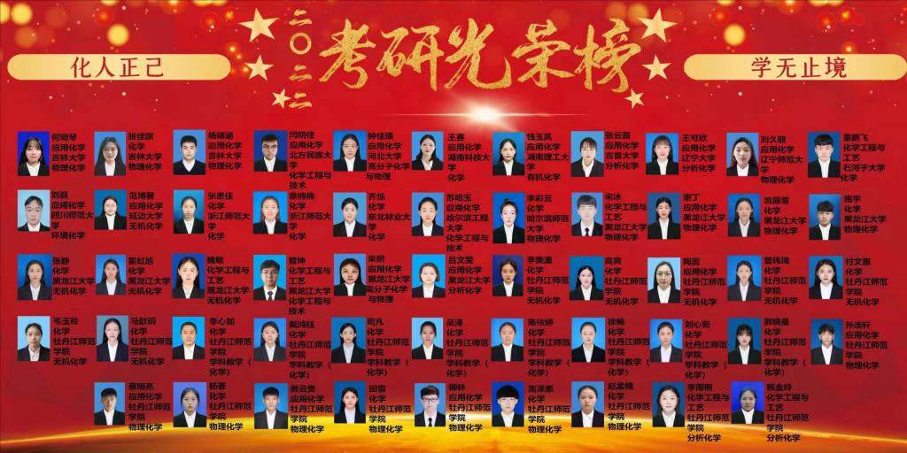 2022年11月18日更新 浏览次 化学化工学院2022届考研光荣榜 序号 姓名 升学院校 研究生专业 1 何明琴 吉林大学 物理化学 2 张佳琪 吉林大学 物理化学 3 杨靖涵 吉林大学 物理化学 4 闫明佳 北方民族大学 化学工程与技术 5 钟佳瑛 河北大学 高分子化学与物理 6 王赛 湖北科技大学 化学 7 钱玉凤 湖南理工大学 有机化学 8 张云霞 吉首大学 分析化学 9 王可欣 辽宁大学 分析化学 10 刘久丽 辽宁师范大学 物理化学 11 董鹏飞 石河子大学 化学 12 刘磊 四川师范大学 环境化学 13 范博馨 延边大学 无机化学 14 张思佳 浙江师范大学 化学 15 詹楠楠 浙江师范大学 化学 16 齐烁 东北林业大学 化学 17 苏明玉 哈尔滨工程大学 化学工程与技术 18 李彩云 哈尔滨师范大学 物理化学 19 宋冰 黑龙江大学 物理化学 20 谢丁 黑龙江大学 物理化学 21 岂丽雪 黑龙江大学 物理化学 22 施宇 黑龙江大学 物理化学 23 张静 黑龙江大学 无机化学 24 霍虹旭 黑龙江大学 无机化学 25 魏敏 黑龙江大学 无机化学 26 曾坤 黑龙江大学 化学工程与技术 27 朱妍 黑龙江大学 高分子化学与物理 28 吕文雯 黑龙江大学 分析化学 29 李美潼 betway中国西汉姆联官网 无机化学 30 高爽 betway中国西汉姆联官网 无机化学 31 陶蕊 betway中国西汉姆联官网 无机化学 32 曾玮琦 betway中国西汉姆联官网 无机化学 33 付文惠 betway中国西汉姆联官网 无机化学 34 毛玉玲 betway中国西汉姆联官网 无机化学 35 马歆玥 betway中国西汉姆联官网 无机化学 36 李心如 betway中国西汉姆联官网 学科教学(化学) 37 戴鸿钰 betway中国西汉姆联官网 学科教学(化学) 38 司凡 betway中国西汉姆联官网 学科教学(化学) 39 吴泽 betway中国西汉姆联官网 学科教学(化学) 40 陈依婷 betway中国西汉姆联官网 学科教学(化学) 41 徐畅 betway中国西汉姆联官网 学科教学(化学) 42 刘心茹 betway中国西汉姆联官网 学科教学(化学) 43 郭晓曼 betway中国西汉姆联官网 学科教学(化学) 44 孙浩轩 betway中国西汉姆联官网 物理化学 45 蔡明亮 betway中国西汉姆联官网 物理化学 46 杨荟 betway中国西汉姆联官网 物理化学 47 郝云贵 betway中国西汉姆联官网 物理化学 48 田雪 betway中国西汉姆联官网 物理化学 49 柳林 betway中国西汉姆联官网 物理化学 50 高泽原 betway中国西汉姆联官网 物理化学 51 赵孟楠 betway中国西汉姆联官网 物理化学 52 李雨桐 betway中国西汉姆联官网 分析化学 53 韩金玲 betway中国西汉姆联官网 分析化学