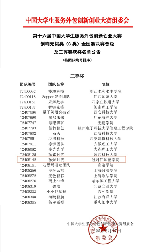 6月17日,第16届中国大学生服务外包创新创业大赛全国赛圆满结束。经过层层选拔,激烈角逐,2022级本科生王海旭带队的项目《碳烯时代》荣获三等奖。