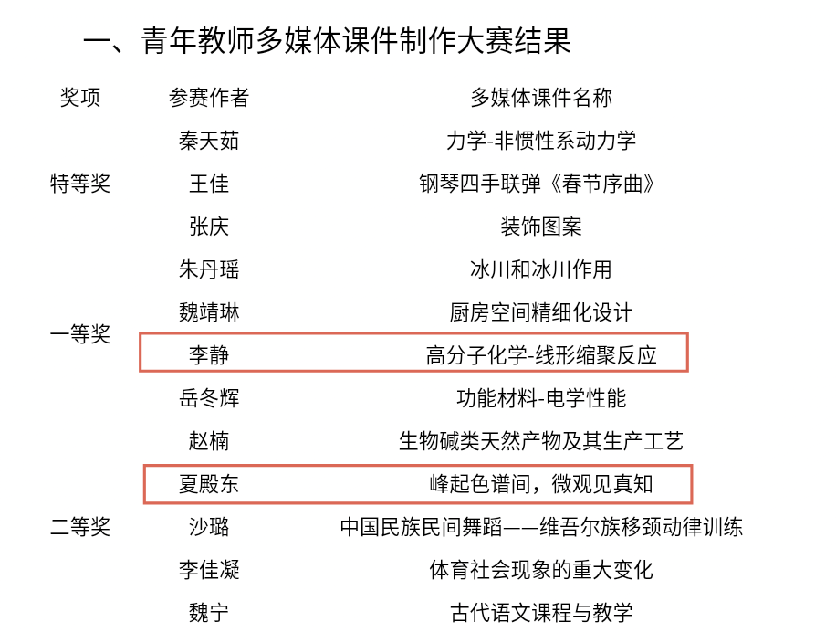 2025年05月24日更新 浏览次 喜报!我院多位教师在校级青年教师多媒体课件制作大赛和微课教学比赛中喜创佳绩! 为进一步推进教育强国建设与高等教育高质量发展,落实立德树人根本任务,近期,校级青年教师多媒体课件制作大赛和微课教学比赛顺利举办。经激烈比拼,我院再传捷报!李静老师荣获多媒体课件设计大赛一等奖,夏殿东老师荣获多媒体课件设计大赛二等奖;肖同欣老师荣获微课教学比赛一等奖。 此次多媒体课件制作与微课教学比赛不仅展示了教师个人的荣誉,更彰显了我院在师资培养、教学改革上的成效。未来,我院将持续推动教学能力提升工程,鼓励教师深耕课堂、创新实践,以高质量教学助力人才培养,为教育发展注入活力!