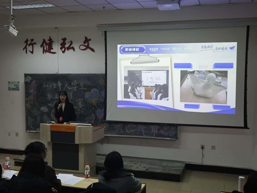 为增强大学生科学规划职业生涯的意识,引导大学生树立正确的成才观、择业观、就业观,努力提高大学生就业创业能力,化学化工学院于10月29日14:00在五角大楼103室开展2025年大学生职业规划大赛。此次大赛特别邀请音乐与舞蹈学院党委副书记杨柳,化学化工学院苏爽月、王雪担任本次比赛评委,化学化工学院党委副书记魏代梅、辅导员杨艾琳莅临出席现场。