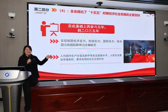 宣讲会上,党委书记邵艳秋系统介绍了全会召开背景、参会人员、主要议程以及全会审议通过的“十五五”规划建议等核心内容。她既从“十五五”时期发展指导原则、目标任务等维度展开阐释,也对全会在国家安全、全面从严治党等方面的部署要求进行解读。她结合学院实际,要求全体师生将全会精神与学科实践紧密结合,以实际行动助力“十五五”规划落地实施。