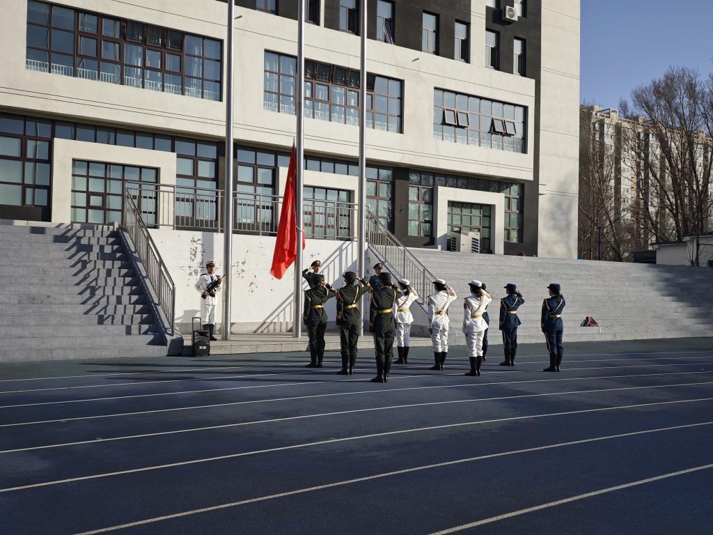 晨光熹微,升旗仪式准时开始。国旗护卫队身姿挺拔,迈着整齐有力的步伐护送国旗走向升旗台。庄严的国歌奏响,五星红旗缓缓升起、迎风飘扬,全体师生庄严肃立,目光坚定地注视着国旗。
