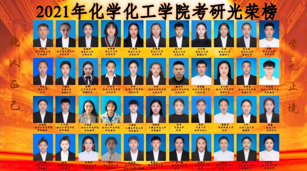 2021年04月29日更新 浏览次 化学化工学院2021届考研光荣榜 序号 姓名 升学院校 研究生专业 1 赵宇豪 贵州师范大学 学科教学(化学) 2 崔玉 哈尔滨师范大学 无机化学专业 3 惠婉婷 黑龙江大学 分析化学专业 4 汝雅馨 黑龙江大学 分析化学专业 5 卢美婷 黑龙江大学 无机化学专业 6 孙媛媛 黑龙江大学 无机化学专业 7 唐子轩 黑龙江大学 无机化学专业 8 范艺鹤 黑龙江大学 物理化学专业 9 王娟 黑龙江大学 物理化学专业 10 郑文秀 黑龙江大学 物理化学专业 11 顾鹏 黑龙江大学 有机化学专业 12 李红晶 湖北大学 化学专业 13 于超男 吉林大学 物理化学专业 14 姜鹤 辽宁师范大学 物理化学专业 15 初晶莹 betway中国西汉姆联官网 无机化学专业 16 李妍 betway中国西汉姆联官网 无机化学专业 17 李妍 betway中国西汉姆联官网 无机化学专业 18 魏存宇 betway中国西汉姆联官网 无机化学专业 19 崔国鑫 betway中国西汉姆联官网 无机化学专业 20 孟凡旭 betway中国西汉姆联官网 物理化学专业 21 熊海鹰 betway中国西汉姆联官网 物理化学专业 22 宋雨婷 betway中国西汉姆联官网 学科教学(化学) 23 王旭博 betway中国西汉姆联官网 学科教学(化学) 24 王永亮 betway中国西汉姆联官网 学科教学(化学) 25 许晓航 betway中国西汉姆联官网 学科教学(化学) 26 张月影 betway中国西汉姆联官网 学科教学(化学) 27 于耀泉 内蒙古师范大学 学科教学(化学) 28 侯晓锐 内蒙古师范大学 学科教学(化学) 29 张雨 宁波大学 化学专业 30 周瑶 宁夏大学 材料与化工专业 31 董晓昱 陕西科技大学 化学专业 32 吕欣 沈阳工业大学 物理学专业 33 徐鑫 延边大学 分析化学专业 34 刘明丽 伊犁师范大学 学科教学(化学) 35 杨雪 伊犁师范大学 学科教学(化学) 36 吴海娇 长春工业大学 无机化学专业 37 徐扬 浙江师范大学 分析化学专业 38 原焱焱 浙江师范大学 高分子化学与物理专业 39 樊锁江 浙江师范大学 化学专业 40 黄子懿 浙江师范大学 化学专业 41 唐梅芳 浙江师范大学 化学专业 42 许铂文 浙江师范大学 化学专业 43 张萌 浙江师范大学 物理化学专业 44 茹莉莹 浙江师范大学 有机化学专业