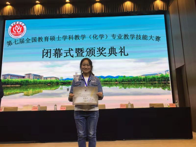 本次大赛分为初赛和决赛两个阶段,我院推荐的三名硕士研究生中有两人进入决赛,与来自全国各地51所参赛院校的99名选手共聚美丽的“山城”重庆市。本次决赛内容从人教版高中课标《化学》(必修)教材中选取三个课题,每个课题参赛选手需提前准备45分钟完整的教学设计方案,现场抽签确定课题进行10分钟模拟授课,课后进行答辩,由评委打分决定名次。最终,我院杜林林同学获得二等奖,段博欣同学获得优秀教学设计奖,王慧教授获得优秀指导教师奖。